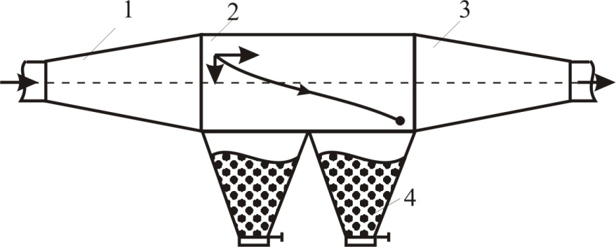 1 - вхідний патрубок; 2 - корпус; 3 - вихідний патрубок; 4 - бункер