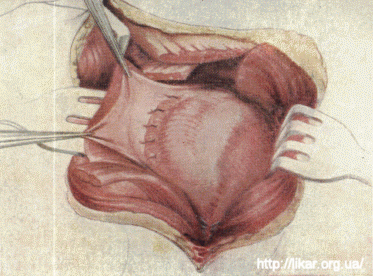 Делают разрез от акромиона вниз по sulcus deltoideopectoralis до нижней границы прикрепления дельтовидной мышцы через все ткани до суставной капсулы. Плечо ротируют кнаружи и под хирургической шейкой, максимально с внутренней стороны, просверливают сквозное отверстие. Затем берут ленту широкой фасции бедра длиной около 25 см и шириной 2-3 см. Эту ленту проводят через ранее сделанный : канал IB плечевой кости и энергично подтягивают ее концы; один конец подшивают « акромиону, другой - к .клювовидному отростку. Выполнив, таким образом, теносуспензию подшивают наружный край ленты к внутреннему к подлежащим частям суставной капсулы. Соприкасающиеся между собой края фасциальной ленты сшивают. Таким образом, дополнительно создаются две новые связки (lig. coracohumerale и lig. acromiohumerale), а также укрепляется « создается новая крепкая передняя стенка суставной сумки в ее наиболее слабом месте.