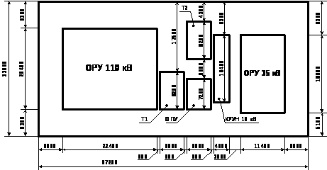 На рис. 1 показан план КТП [§ 6-3, Л6]. В состав подстанции входят два трансформатора напряжением 110/35/10 кВ, открытые распределительные устройства (ОРУ) 110 и 35 кВ, комплектное распределительное устройство для наружной установки (КРУН) 10 кВ и здание общеподстанционного управления (ОПУ).