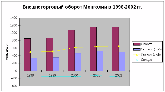 Но политика открытости внешнему миру имеет целью формирование и предоставление благоприятных условий, стимулирующих приток в страну иностранного капитала, передового зарубежного оборудования и технологий, современных методов управления в сферах производства и сервиса. Экспорт в КНР, США, Россию, Южную Корею, Австралию, Великобританию, Италию, Японию составляет 98% общего экспорта Монголии. Соответственно 90% общего импорта Монголии приходится на следующие страны: Российскую Федерацию, КНР, Южную Корею, Японию, Германию, США, Сингапур, Австралию (см. Приложение 3). На долю ГОК “Эрдэнэт” в 1999г. приходится 60% общего экспорта, 35% ВВП Монголии1, причем медный концентрат большей частью экспортировался в КНР, Россию, Южную Корею, Японию и Казахстан (95,6%), а молибден (83,7%) – в Китай, США, Россию, Швейцарию2.