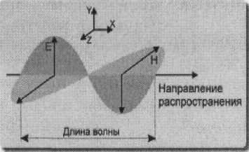 Изменяющееся во времени электрическое поле Е порождает магнитное поле Н, а изменяющееся магнитное поле - вихревое электрическое поле. Это является физической причиной существования электромагнитного поля. Непрерывно изменяясь, обе компоненты поддерживают существование электромагнитного поля. Поле неподвижной или равномерно движущейся частицы неразрывно связано с носителем (заряженной частицей). Однако при ускоренном движении заряженных частиц, ЭМП «отрывается» от них и существует в окружающей среде независимо, в виде электромагнитных волн (рис.), не исчезая с устранением источника (например, радиоволны не исчезают при исчезновении тока в излучившей их антенне) [22].