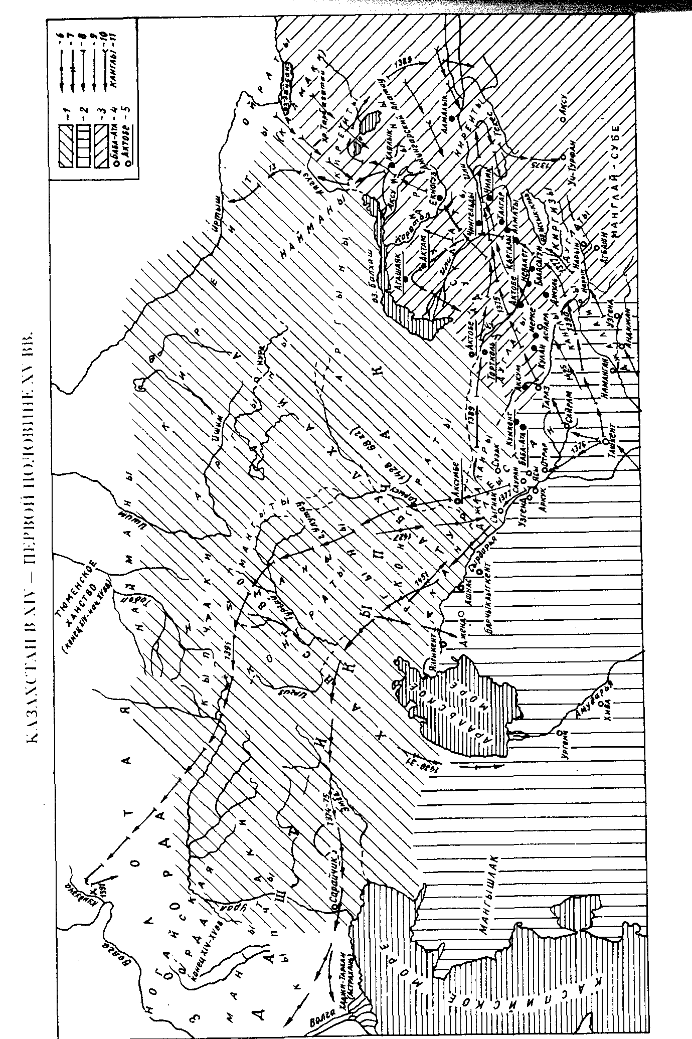 нескольких государственных образований. Следует отметить, что в XIV—XV вв. продолжались многочисленные миграции. Так, во время войн Тимура переместились могульские группы из Семиречья в Среднюю Азию' При Абулхайр-ханс откочевали к нему из Могули-стана племена калучи ибулгачи, на каком-то этапе переместились из Семиречья киреи в Средний жуз, мангыты-ногайцы переместились с запада на Сырдарью; на исходе XV в. ушли в Среднюю Азию с Мухаммедом Шайбани-ханом многие роды и племена из восточного Дешт-и Кыпчака. Все это дестабилизировало политическое положение и затрудняло этническую консолидацию .населения обширной территории Казахстана.