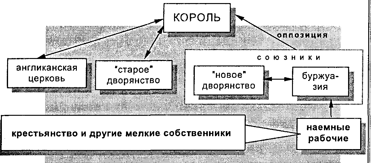 Подавляющую часть дворянства (среднего и мелкого) составляло появившееся в XVI в. "новое" дворянство. Оно активно приспосабливало свои владения к запросам рынка. Но новый дворянин не ограничивался земледелием или овцеводством. Его новизна как раз и заключалась в том, что одновременно он стремился и был коммерсантом, пайщиком компании, судовладельцем, промышленником и т.п. Будучи дворянином по своему сословному положению, он выступал как буржуа в хозяйственных и финансовых делах. Его главной целью было получение как можно большей прибыли. Поэтому задолго до революции сложился союз нового дворянства с буржуазией (предприниматели, торговцы, цеховые мастера и пр).). Основную массу английских крестьян составляли лично свободные, но поземельно зависимые от владельца земли (лендлорда) копигольдеры (держатели земли по договору; на руках у них была копия этого договора). Их полная зависимость от дворян-лендлордов делала их убежденными врагами феодализма.