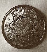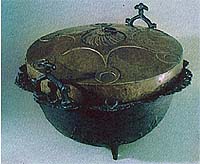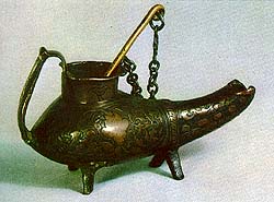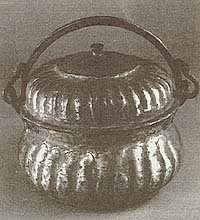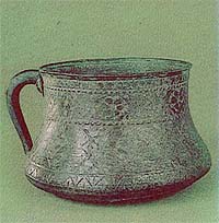 Кубачинский сосуд “нукнус”, напоминающий ведерко, также оригинален по форме. В прошлом нукнус, являясь частью приданого, имел обрядовое назначение: в нем невеста приносила в день свадьбы муку, сахар или мед с ложками, воткнутыми черенками вниз. Через сорок дней содержимое ведерка раздавалось жителям селения. Ведерки обычно занимают верхнюю полку в комнате-музее и служат доказательством богатства хозяина. Их количество в домах колеблется от четырех до десяти. Кубачинки чистят эти ведерки древесным углем с таким усердием, что часто протирают их до дыр: существует поверье, что нечищеная посуда привлекает злых духов, которые боятся блеска. Основной мотив орнамента на нукнусе — “копытца”, соединенные между собой точечным узором, который образует звездочки, полукружия...