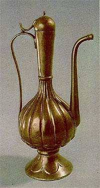 Аварские водоносные кувшины из Гоцатля обычно выполнялись из красной меди и покрывались полудой. Это строгие монументальные сосуды с шаровидным туловом, высоким узким горлом и откидной крышкой. Скульптурность форм подчеркнута чеканными полосками, расположенными поперек горловины и на поддоне, выпуклыми медальонами на “плечиках” с элементами гравированного растительного орнамента, который оттеняет красный цвет меди на фоне серебристой полуды. На более старых изделиях, покрывавшихся полудой много раз, гравированный орнамент почти не виден, а основную декоративную роль играют чеканные элементы.