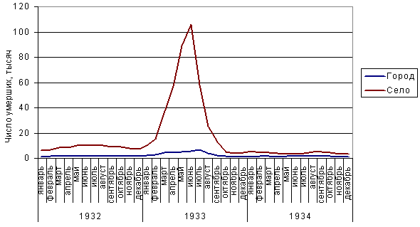 В архивах сохранились помесячные сведения о числе зарегистрированных смертей по некоторым территориям. В них, конечно, тоже отразился недоучет смертей, но все же по этим сведениям можно твердо судить о том, что общее повышение смертности, начавшееся с 1929 года, в 1933 году превратилось в резкий взрывоподобный рост, который продолжался до лета 1934 года, то есть до нового урожая. Так, в Киевской и Харьковской областях, по которым имеются такие сведения, в весенне-летние месяцы 1933 года смертность сельского населения выросла более чем в 6 раз при сравнительно небольшом подъеме смертности горожан (график №1 и№2). Тысячи трупов, которые подбирали на улицах городов, были трупами крестьян, тщетно искавших спасения в относительно более сытых городах.
