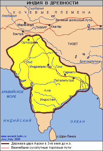 Индия по размерам своей территории и по количеству населения уже в далёком прошлом, также как теперь, принадлежала к числу самых крупных стран Азии. Резкие грани, созданные самой природой, отрезали её от внешнего мира и затруднили связи с другими странами и народами. На юге, юго-западе и юго-востоке она омывается обширными водными пространствами Индийского океана, Аравийского моря и Бенгальского залива. На севере она замыкается величайшим и высочайшим в мире горным хребтом – Гималаями. Горные преграды, хотя и не столь непреодолимые, но достаточно мощные, отделяют Индию на западе от Ирана и на востоке от Индокитая.