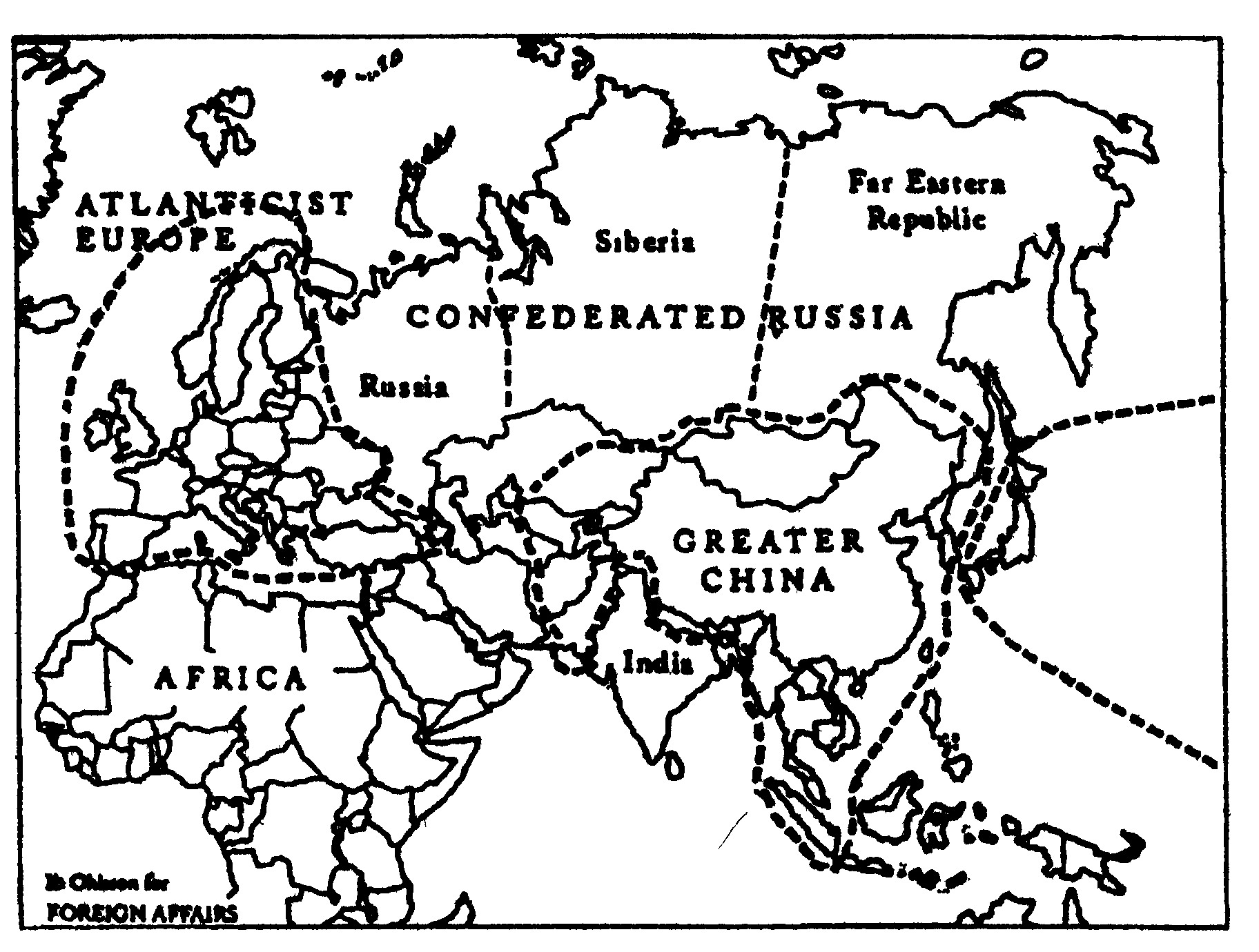 В юбилейном журнале Foreign Affairs за сентябрь-октябрь 1997 года, являющимся печатным Органом Совета по международным отношениям1, была опубликована карта «новой» России. Ее западная граница проходит по линии между Курском и Петрозаводском, южная - между Ростовом и Волгоградом, восточная — по Уралу. Появляются Дальневосточная и Сибирская республики (без южных регионов, отданных Японии и Китаю). Отторгаются от России Северный Кавказ, Ставропольский и Краснодарский края, Брянская, Смоленская, частично Московская и Тверская, Псковская, Новгородская, Ленинградская области, Карелия и Кольский полуостров. В посвящении журналу Бжезинский написал: «Моим студентам — чтобы помочь им формировать очертания мира завтрашнего дня».