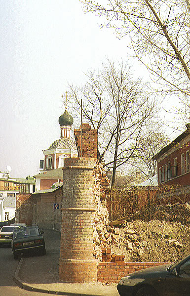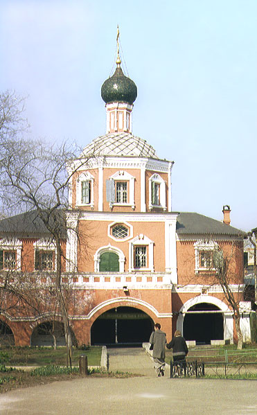 В 1696 г. на средства стольника Петра I Андрея Леонтьевича Римского-Корсакова были сооружены парадные въездные ворота с надвратной церковью Спаса Нерукотворного Образа. В центре, под храмом, устроен широкий сводчатый проезд, а с восточной стороны (под алтарем) - более узкий сводчатый проход. Композицию дополняет небольшая, одной высоты с алтарем, трапезная. С юга и запада храм обходит открытая галерея - гульбище. Сохранившийся надвратный храм монастыря, теперь представляет собою одну из древнейших построек Остоженки.