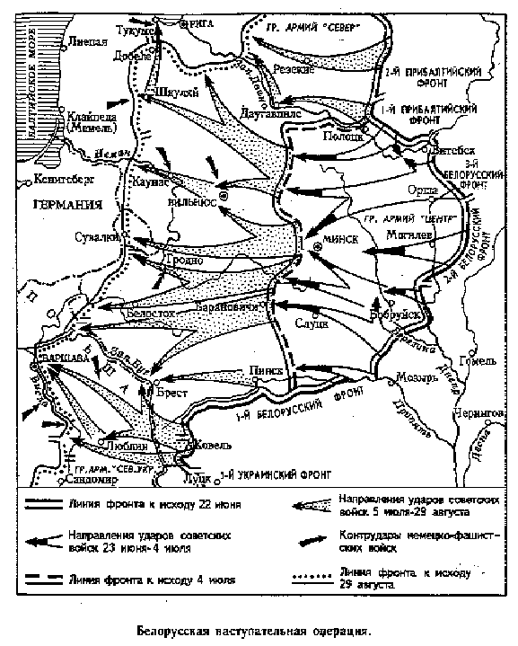 К началу операции численность войск четырех фронтов и флотилии составляла 2 миллиона 330 тысяч человек, кроме того, в частях 1-ой армии Войска Польского, принимавших участие в этой операции, насчитывалось 80 тысяч человек2. На вооружении войск фронтов имелось 35 тысяч орудий и минометов, 5 тысяч танков и 5,5 тысяч боевых самолетов3. Белорусская стратегическая операция проводилась в два этапа.