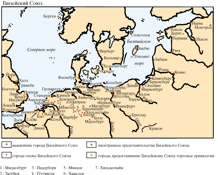 К числу ганзейских принадлежали Льеж и Амстердам, Ганновер и Кельн, Геттинген и Киль, Бремен и Гамбург, Висмар и Берлин, Франкфурт и Штеттин (ныне Щецин), Данциг (Гданьск) и Кенигсберг (Калининград), Мемель (Клайпеда) и Рига, Пернов (Пярну) и Юрьев (Дерпт, или Тарту), Стокгольм и Нарва. В славянских городах Волин, что в устье Одера (Одры) и на нынешнем польском Поморье, в Кольберге (Колобжеге), в латышском Венгспилсе (Виндаве) существовали крупные ганзейские фактории, которые оживленно скупали местные товары и, к общей выгоде, продавали привозные.