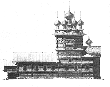 Но в отличие от Кондопожской церкви саминский памятник в конце XIX века претерпел на себе всю силу искажений. Сейчас его реставрируют: снимают его наружную обшивку— футляр, металлическое покрытие луковичных главок заменяют пластинчатым лемехом; отторгают как чужеродный элемент колокольню, пристроенную к церкви во второй половине XIX века (автор проекта реставрации Б. П. Зайцев).