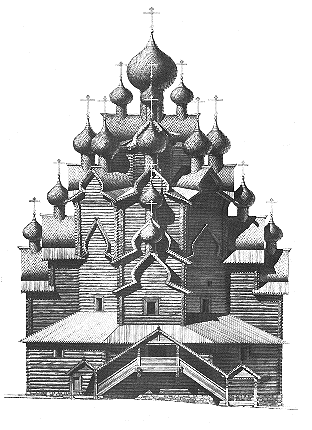 Вот в этой-то атмосфере возник величественный образ двадцатидвухглавой Преображенской церкви, звучащий как торжественный гимн героическому русскому народу в честь его исторической победы.
