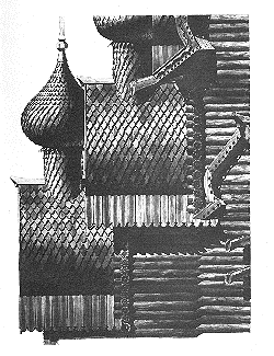 А ведь именно с этой целью— умалить, приглушить звучание дорогих народу образов древних деревянных церквей—строились рядом с ними новые. Но тривиальная невыразительность позднейших построек только ярче выступала в соседстве с величавыми памятниками старины.