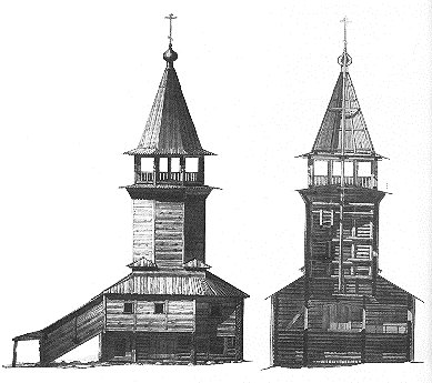 Низкое основание четверика колокольни, рубка ее углов «в обло», повал восьмерика, наконец, общее конструктивное устройство и пропорции здания— все это свидетельствует о верности древним традициям.