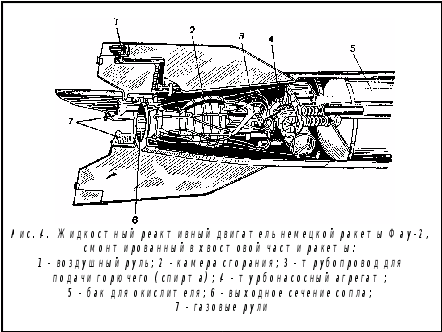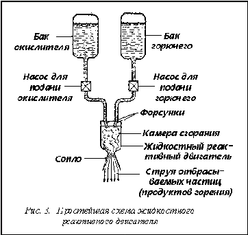 Простейший реактивный двигатель на жидком топливе (рис. 3) представляет собой камеру, похожую по форме на горшок, в котором жители сельских местностей хранят молоко. Через форсунки, расположенные на днище этого горшка, происходит подача жидкого горючего и окислителя в камеру горения. Подача компонентов топлива рассчитывается таким образом, чтобы обеспечить полное сгорание. В камере сгорания (рис. 3) происходит воспламенение топлива, и продукты горения — горячие газы — с большой скоростью выбрасываются через специально профилированное сопло. Окислитель и горючее помещаются в специальных баках, располагающихся на ракете или самолете. Для подачи окислителя и горючего в камеру сгорания применяют турбонасосы или выдавливают их сжатым нейтральным газом (например, азотом). На рис. 4 приведена фотография реактивного двигателя немецкой ракеты Фау-2.