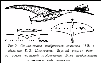 Аэроплан Циолковского (рис. 2) имеет форму «застывшей парящей птицы, но вместо головы ее вообразим два гребных винта, вращающихся в обратные стороны... Мускулы животного мы заменим взрывными нейтральными двигателями. Они не требуют большого запаса топлива (бензина) и не нуждаются в тяжелых паровиках и больших запасах воды. ...Вместо хвоста устроим двойной руль — из вертикальной и горизонтальной плоскости. ...Двойной руль, двойной винт и неподвижность крыльев придуманы нами не ради выгоды и экономии работы, а единственно ради исполнимости конструкции».