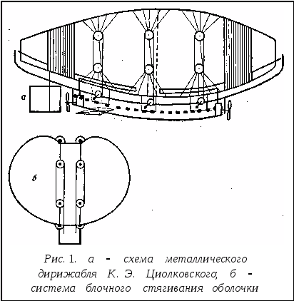 Дирижабль Циолковского имел следующие характерные особенности. Во – первых, это был дирижабль переменного объема, что позволяло сохранять постоянную подъемную силу при различных температурах окружающего воздуха и различных высотах полета. Возможность изменения объема конструктивно достигалась при помощи особой стягивающей системы и гофрированных боковин (рис. 1)