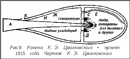 Ракета 1915 года. В книжке Перельмана «Межпланетные путешествия», изданной в 1915 году в Петрограде, помещены чертеж и описание ракеты, выполненные Циолковским.