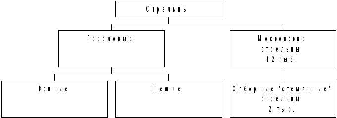 Предшественниками стрельцов были отряды пищальников, созданные при Василии III. Стрелецкое войско делилось на городовых и московских стрельцов. Городовые стрельцы, жившие в различных русских городах, были конные и пешие. 12 тыс. московских стрельцов (в том числе 2 тыс. отборных стремянных) являлись пехотинцами. Стрельцы имели на вооружении аркебузы (пищали). В бою стрельцы устанавливали их на специальные топоры-подставки – бердыши – и вели огонь по противнику. Запас пуль стрельцы носили в кожаных мешочках на перевязи, каждый пищальщик имел также рог для пороха.