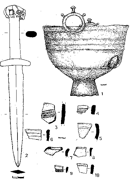Рис. 1. Материалы к археологии раннего железного века Кузнецкой котловины. 1,3-10 - поселение Шабаново-VI, 2 - местонахождение Ракитный. 1 - котел, 2 - кинжал, 3-10 - фрагменты посуды. 1,2 - бронза, 3-10 - керамика.