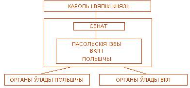 Паводле дамовы 1569 г. стваралася федэратыўная дзяржава "абодвух народаў" – Рэч Паспалітая. На чале яе стаяў кароль (ён жа вялікі князь). Кароль выбіраўся пажыццёва шляхтай. Ён мог быць толькі католікам. Ствараўся агульны вальны сойм, які складаўся з сената (туды ўваходзілі буйныя магнаты, каталіцкія іерархі і прадстаўнікі караля) і дзвюх пасольскіх ізб, куды павятовыя соймікі накіроўвалі па 2 сваіх прадстаўніка. Мяшчане, сяляне, праваслаўныя і пратэстанцкія святары прадстаўніцтва ў сойме не мелі. У астатнім абедзве дзяржавы захоўвалі суверэнітэт: асобныя ўрады, войскі, мытні, скарбы, манетныя сістэмы, дзяржаўныя мовы і г. д.
