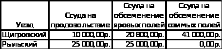 На приведенной таблице ясно видно общее положении губернии. Такой разброс задолжностей по каждому уезду уже частично характеризует относительное состояние в каждом уезде. Кроме того уместно будет огласить данные по суммарному долгу губернии на первое ноября 1890г., которое в общей сложности составляло 326 447. 00 рублей. Эта цифра отличается от имеемой на данный момент на 100 тысяч рублей, что говорит о том, что состояние ухудшилось и вероятнее всего причины кроются не только в плохих для урожая погодных условиях, а они являются закоренелыми и более широко охватывающими. Поскольку и раньше, как мы видим, долги тоже были. Можно отметить, что были и такие уезды, которые практически не имели задолжностей. Это Рыльский и Льговский, тут же и можно увидеть наиболее нуждающиеся уезды. Это Щигровский и Старооскольский.