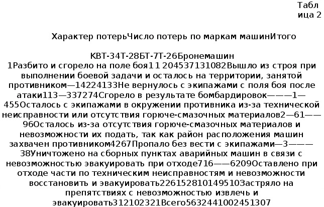 Как мы видим, движение линии фронта назад, общий отход вызывают поистине катастрофические изменения в балансе боеготовых, находящихся в ремонте и безвозвратно потерянных танков. Когда есть понимание общих тенденций, данные по потерям советских механизированных корпусов уже не вызывают сильных эмоций. Перед нами встает вполне обычная «история болезни». Характерную картину дает отчет командира 10-й танковой дивизии 15-го механизированного корпуса, участвовавшей в дубненских боях с момента их завязки в первые дни войны до самого финала (см. таблицу). Потери приведены по данным на 1 августа, но подавляющее большинство их