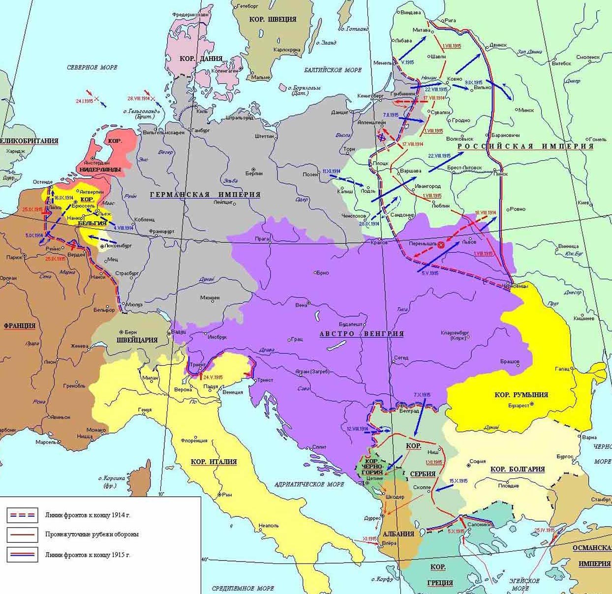 Оставались надежды на то, что на Восточном фронте русские смогут сокрушить армии блока Центральных держав12. 17 августа русские войска вступили в Восточную Пруссию и стали теснить немцев к Кенигсбергу. Руководить контрнаступлением, было поручено немецким генералам Гинденбургу и Людендорфу. Воспользовавшись ошибками русского командования, немцам удалось вбить «клин» между двумя русскими армиями, разгромить их 26–30 августа близ Танненберга и вытеснить из Восточной Пруссии. Австро-Венгрия действовала не столь удачно, отказавшись от намерения быстро разгромить Сербию и сосредоточив крупные силы между Вислой и Днестром. Но русские начали наступление в южном направлении, прорвали оборону австро-венгерских войск и, взяв в плен несколько тысяч человек, заняли австрийскую провинцию Галицию и часть Польши. Продвижение русских войск создало угрозу Силезии и Познани – важным для Германии промышленным районам. Германия вынуждена была перебросить дополнительные силы из Франции. Но острая нехватка боеприпасов и продовольствия остановили продвижение русских войск. Наступление стоило России огромных жертв, но подорвало мощь Австро-Венгрии и вынуждало Германию держать значительные силы на Восточном фронте.