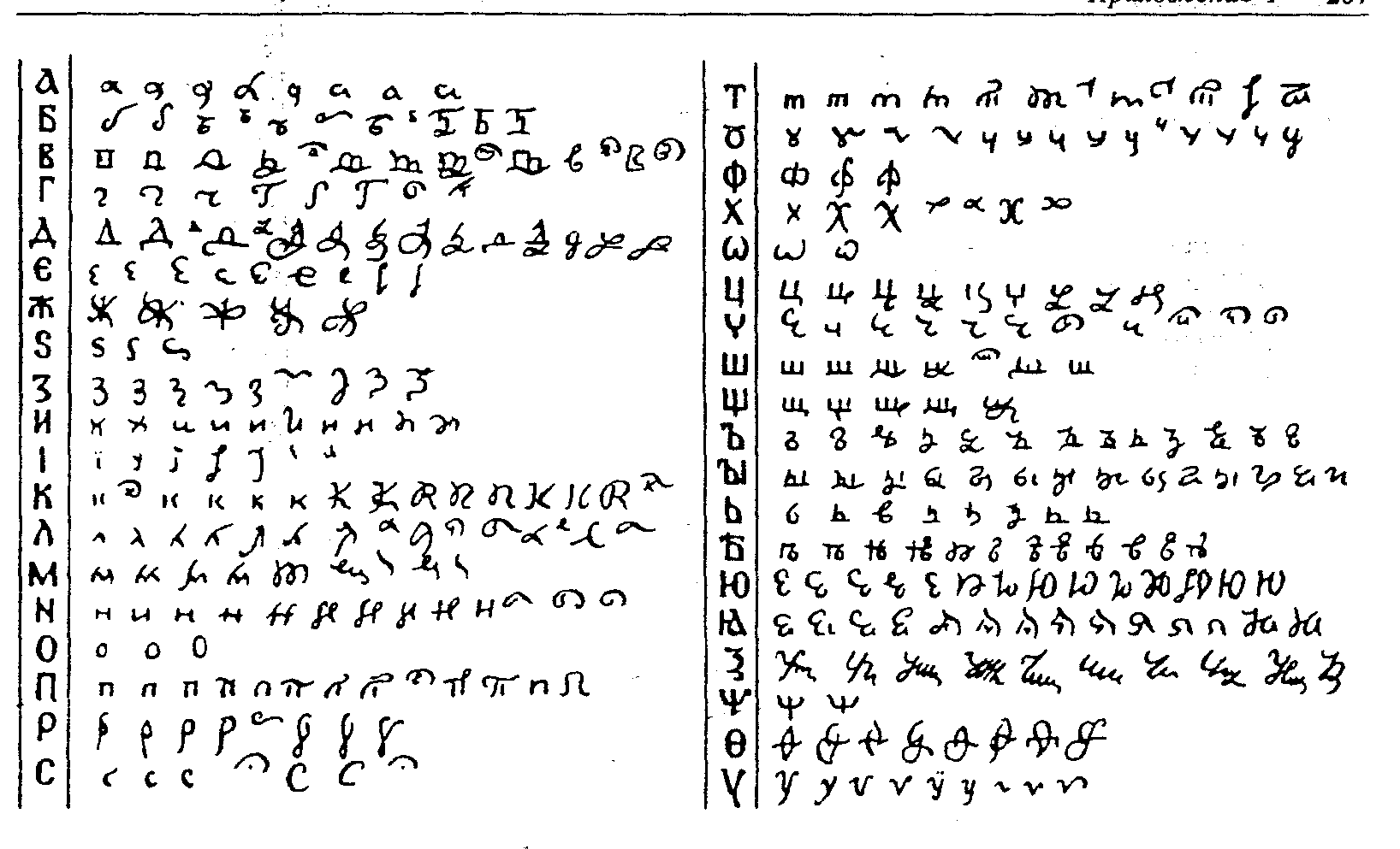 На рисунке приведены основные виды написания отдельных букв Специфическое написание выносных букв дано в конце каждой строки Охарактеризуем некоторые типы, наиболее часто встречающиеся и резко отличные от принятых в наше время буква "в" чаще всего писалась в виде квадрата, у которого нередко скруглен верх, в этом случае ее написание может приближаться к треугольнику. Нижняя черта иногда бывает вытянуто и слегка изогнутой, и тогда "в" легко спутать с "д";