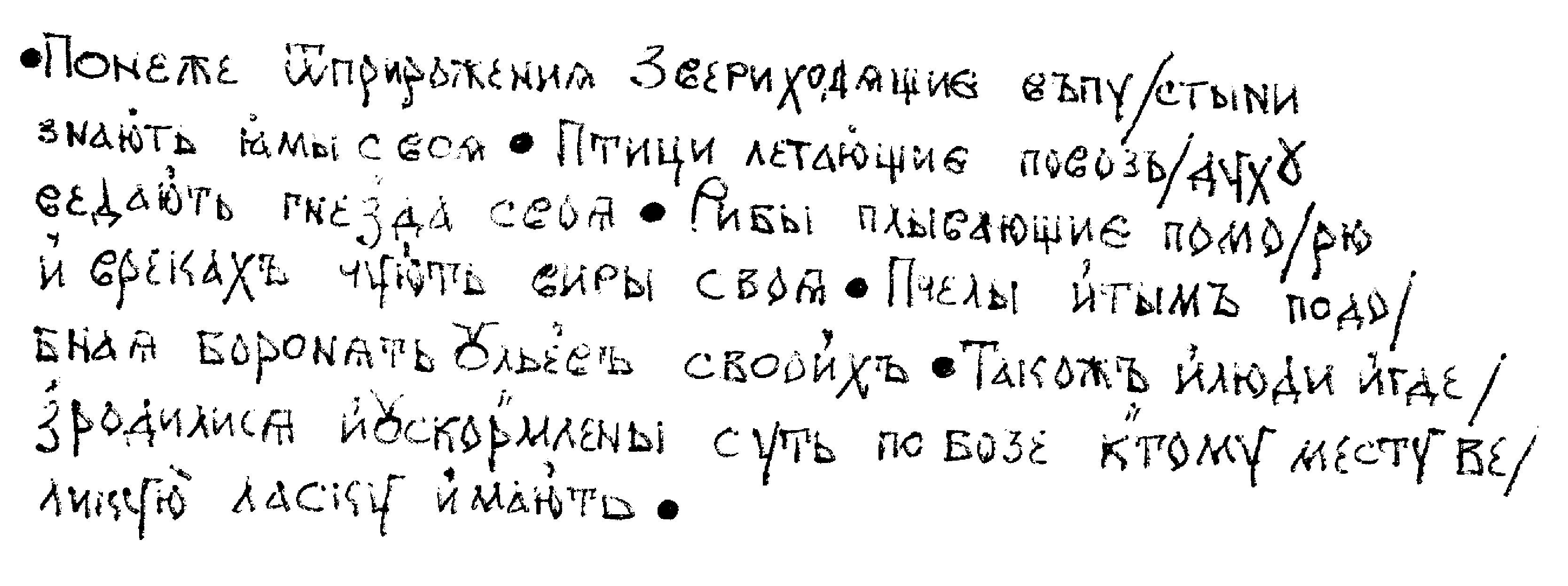 Понеже от прирождения звери, ходящие в пустыни, знають ямы своя; птици, летающие по возъдуху, ведають гнезда своя; рибы, плывающие по морю и в реках, чують виры своя; пчелы и тым подобная боронять ульев своих, - тако ж и люди, игде зродилися и ускормлены суть по бозе, к тому месту великую ласку мають.
