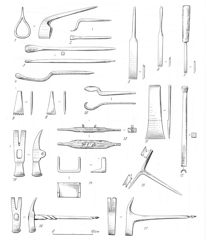 Довольно широкий набор разнообразных инструментов применялся при фигурной обработке дерева и художественной резьбе. Найдены стамески — прямые и косые, стамески с фигурным лезвием, долота с фигурными лезвиями, разнообразные резцы — такие, как клюкарзы с прямым и фигурным лезвием, ножи-косяки и ножи-резаки, ложкари. (рис. 12) [6 – стр. 258].
