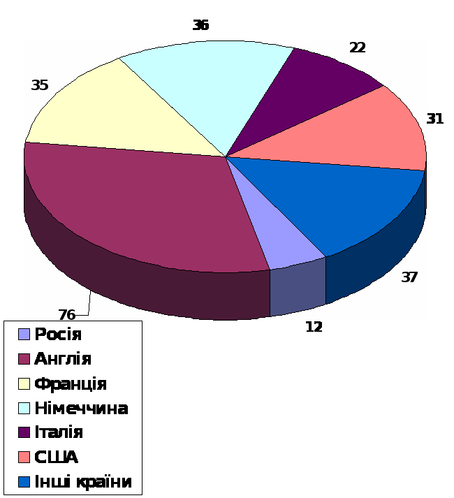 4) Англія. За всіх часів залишалася королевою морів, вихід до світових вод зумовило становлення Англії як морської держави. Країна мала найпотужніший флот у світі. Англія була досить розвиненою індустріальною країною з потужною економікою і промисловістю.