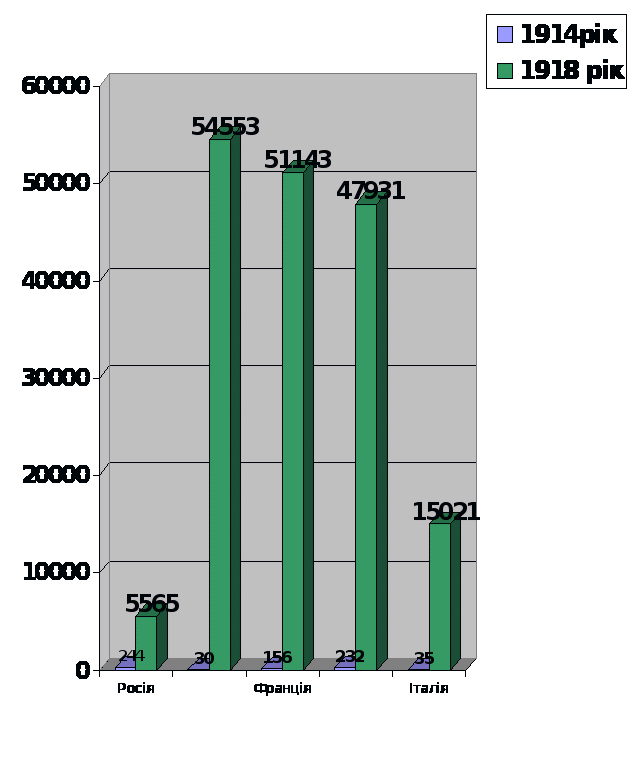 На початок 1914 року авіаційний арсенал основних країн - учасниць війни мав такий потенціал: Англія – 30 літаків; Росія -244; Німеччина-232; Франція – 156; Італія – 35. Наприкінці Першої світової війни спостерігалось збільшення кількості літаків у тисячі разів, а саме: Англія мала 54553 літака; Німеччина – 47931; Італія – 15021; США – 16797; Франція – 51143 літаків ( див.додаток 1 ).
