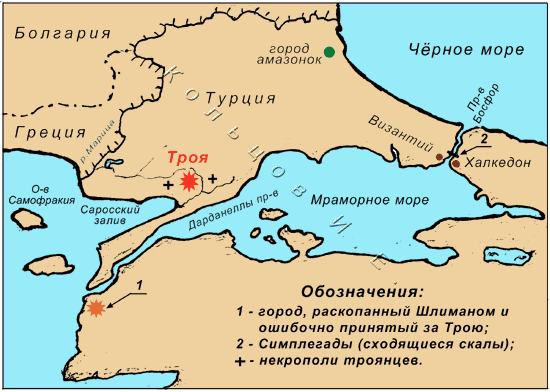 Опираясь на древнеписьменные источники, были проведены многолетние исследования, позволившие определить район реального местоположения гомеровской Трои на европейской части Турции (рис.1). Это не умаляет заслуг Г. Шлимана, который нашёл какой-то город-крепость и клад на азиатской части Турции.