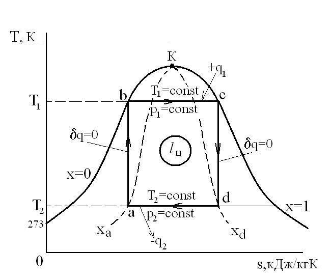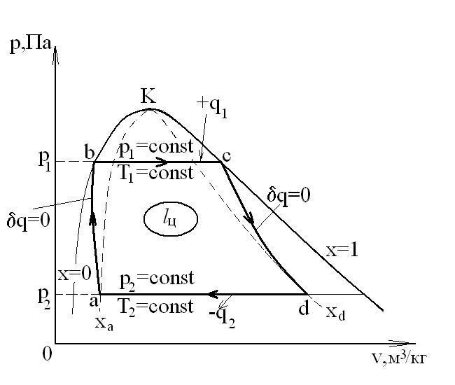 где ab - адиабатное сжатие в компрессоре; bc -подвод теплоты q>1> при Т>1>=const и р>1>=const; cd - адиабатное расширение пара на турбине; da -конденсация пара при Т>2>=const и р>2>=const (отвод теплота q>2>).