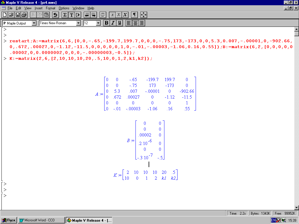 Для примера взята система стабилизации линейного набора высоты. Уравнения системы имеют вид (1.1), матрицы А и В показаны на (рис. 3.1). Ниже представлено: