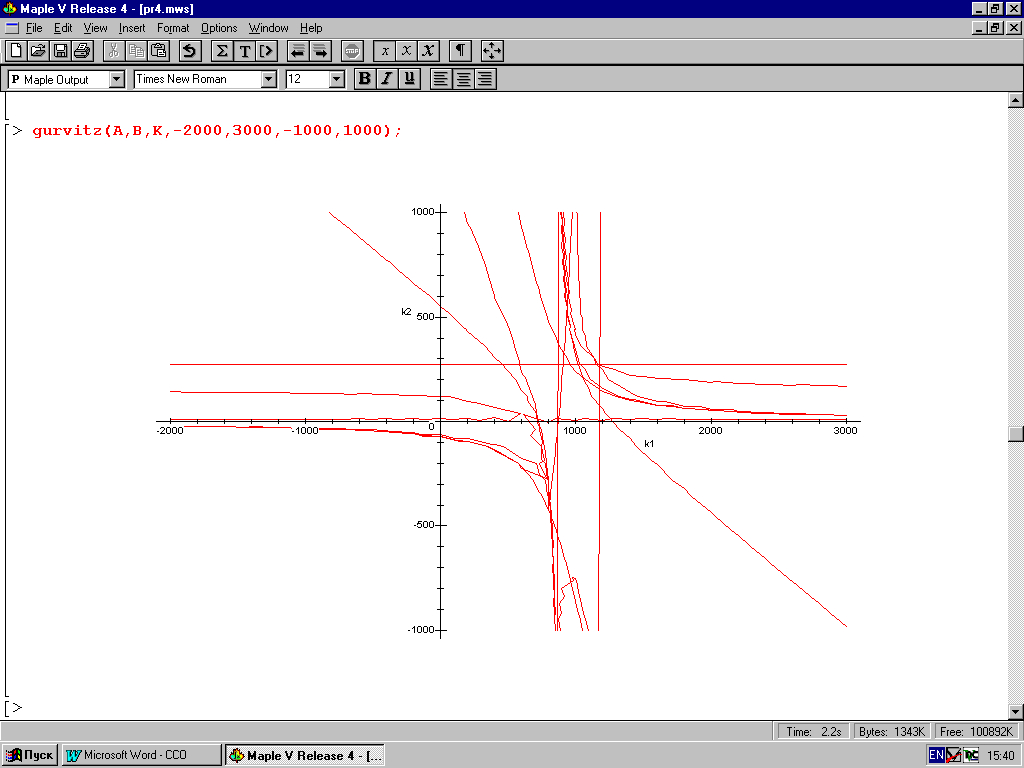Процедура строит особые линии для определения области устойчивости непрерывных систем по критерию Гурвица, описанному в пункте 1.4. При задании матрицы К необходимо два изменяемых параметра обозначить к1 и к2.