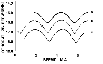 На рисунке представлены: a - модельная кривая блеска астероида 1620 Географ b - кривая блеска от 01.01.1994 г. c - кривая блеска от 04.01.1994 г. |
