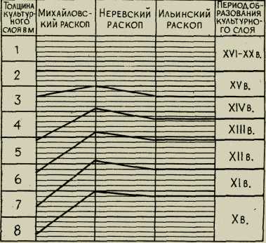 На основе дендрохронологического ода образование культурного слоя можно как бы привязать к определенному веку. На основе картограммы распределения культурного слоя по мощности и привязки его во времени смогли определить датировку культурного слоя в зависимости от времени его образования. Для этого были исследованы три наиболее характерных раскопа: Михайловский, Ильинский и Неревский, в которых зафиксированы слои по XV в. Данные раскопов были сведены в картограмму датировки культурного слоя в зависимости от времени его образования. Из построенной картограммы видно, что слой, относящийся к X в., залегает в среднем на глубине 6,6 м, слой XI в.— 5,9 м, слой XII в.— 4,4 м, слой XIII в.— 3,4 м, слой XIV в.— 2,3 м, слой XV в.— на глубине 1,4 м.