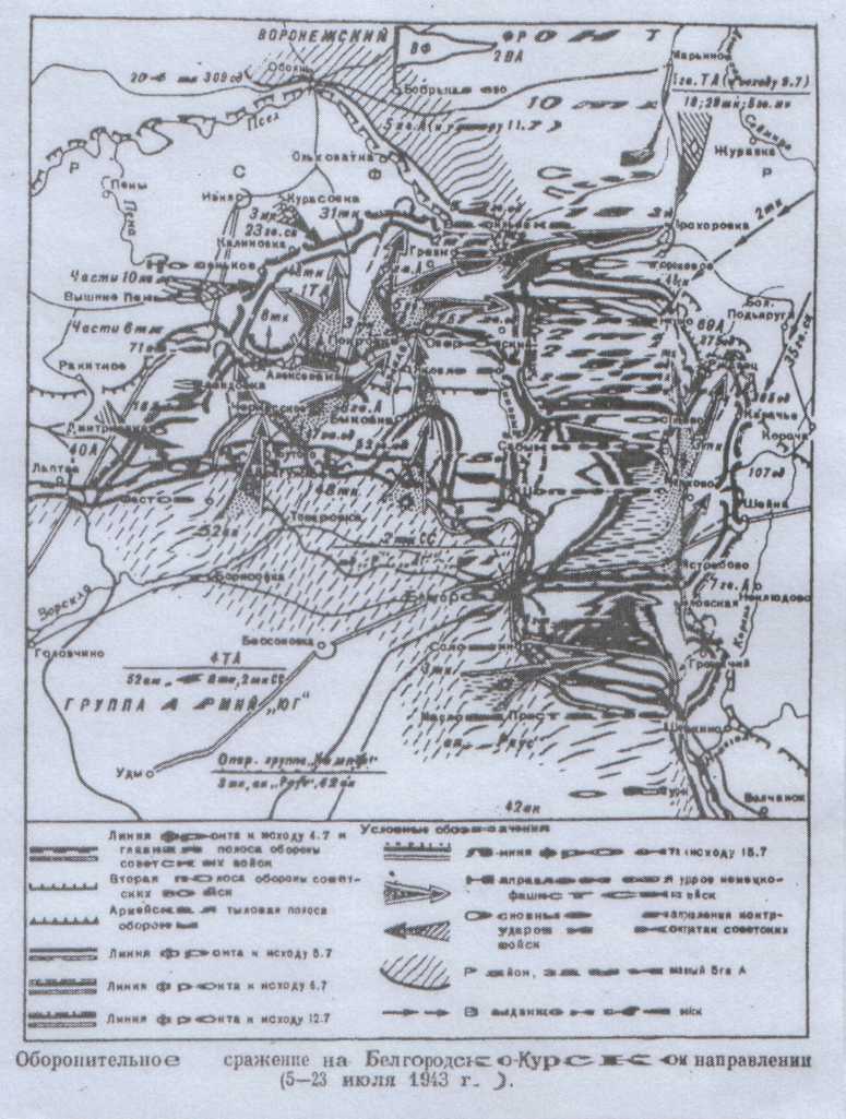 Командование Воронежского и Степного фронтов для достижения успеха прорыва обороны противника решительно массировало силы и средства на направлениях своих главных ударов, что позволило создать высокие оперативные плотности. Так, в полосе 5-й гвардейской армии Воронежского фронта они достигали 1,5 км на стрелковую дивизию, 230 орудий и миномётов и 70 танков и САУ на 1 км фронта.»