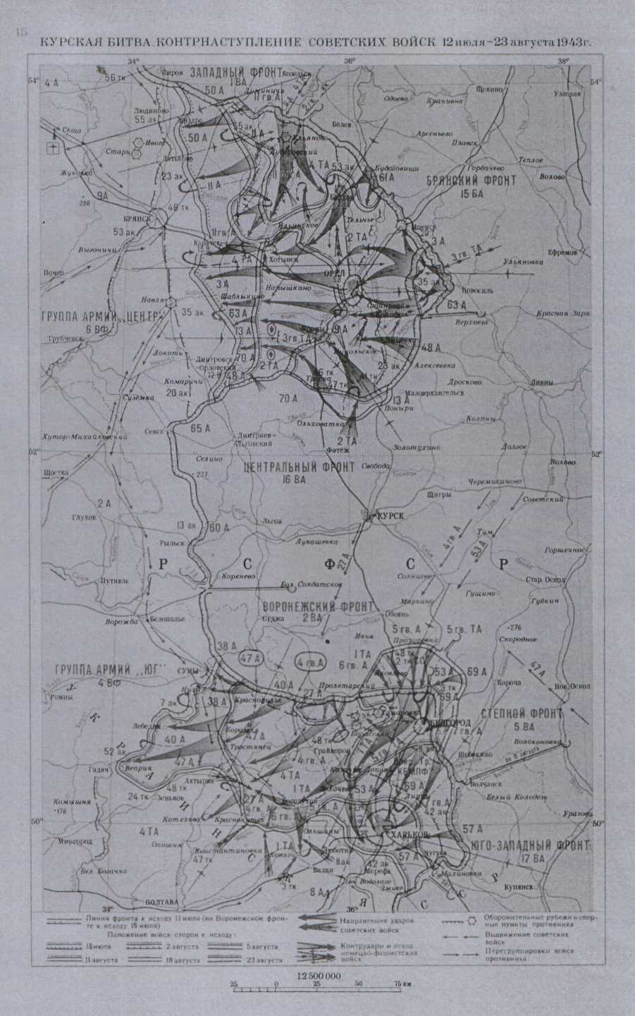 12 июля советские войска, измотав противника, перешли в контрнаступление. В этот день в районе железнодорожной станции Прохоровка произошло крупнейшее встречное танковое сражение второй мировой войны (до 1200 танков и самоходных орудий с обеих сторон). Развивая наступление, советские сухопутные войска, поддержанные с воздуха ударами сил 2-й и 17-й воздушных армий, а так же авиацией дальнего действия, к 23 августа отбросили противника на запад на 140 - 150 км, освободили Орёл, Белгород и Харьков.