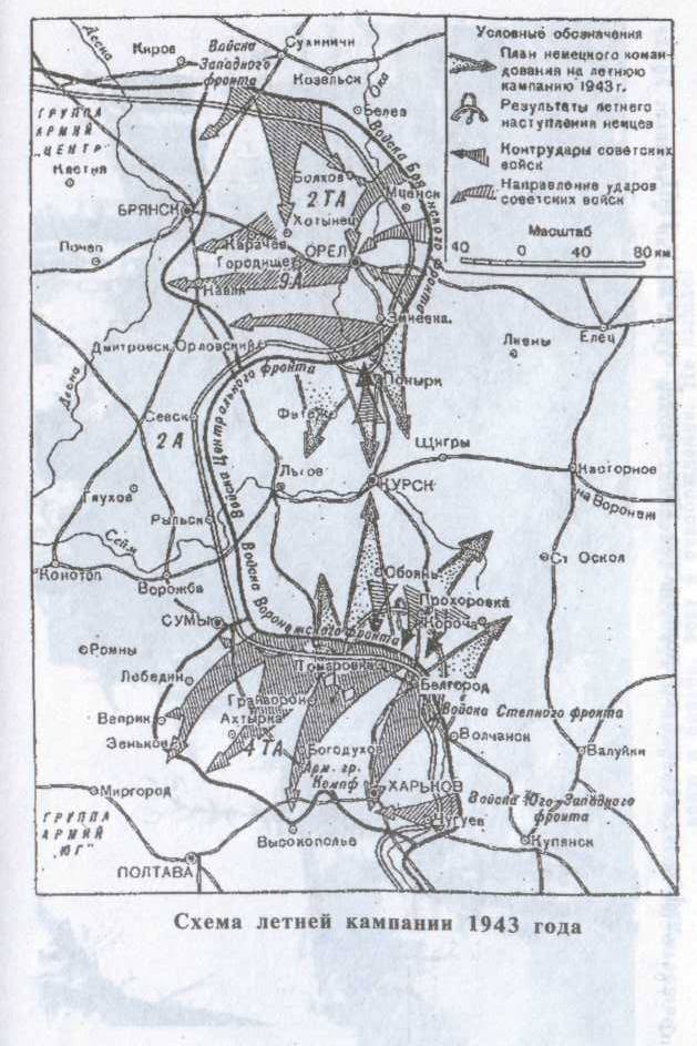Немецко-фашистское командование решило провести летом 1943 г. крупную наступательную операцию и вновь захватить в свои руки стратегическую инициативу. Замысел операции состоял в том, чтобы мощными встречными ударами из районов Орла и Белгорода на Курск окружить и уничтожить советские войска в Курском выступе. В дальнейшем противник намеревался разгромить советские войска в Донбассе. Для Осуществления операции под Курском, получившей название «Цитадель», противником были сосредоточены огромные силы и назначены наиболее опытные военачальники: 50 дивизий, в том числе. 16 танковых, группы армий «Центр» (командующий генерал-фельдмаршал Г. Клюге) и Группы армий «Юг» (командующий генерал-фельдмаршал Э. Манштейн). Всего в составе ударных группировок противника находилось свыше 900 тыс. человек, около 10 тыс. орудий и миномётов, до 2700 танков и штурмовых орудий и более 2000 самолётов. Важное место в замысле противника отводилось применению новой боевой техники—танков «Тигр» и «Пантера», а также новых самолётов (истребителей «Фокке-Вульф-190А» и штурмовиков «Хеншель-129»).
