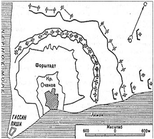 Как уже говорилось, между войнами турки под руководством французских инженеров капитально перестроили Очаковскую крепость. А с началом войны они возвели со стороны суши еще и многочисленные земляные укрепления полевого типа. Очаковский гарнизон достигал 20 тысяч человек.