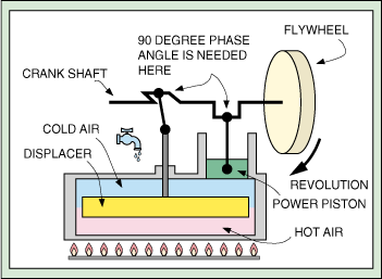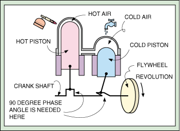 На этом рисунке верхняя часть горячего цилиндра с поршнем (hot piston) постоянно разогревается внешним источником тепла, в то время, как верхняя часть холодного цилиндра с поршнем (cold piston) постоянно охлаждается. Следует обратить внимание, что поршни закреплены на коленчатом валу (crank shaft) так, что обеспечивают сдвиг по фазе на 90 градусов, т.е. в то время, как горячий поршень достигает верхнего положения, холодный находится в среднем положении, двигаясь вверх. Этот момент сооответствует этапу 2-3 на предыдущем рисунке - охлаждению при постоянном объеме. Затем холодный поршень поднимается вверх, сжимая охлажденный газ при постоянной температуре - этап 3-4. Когда холодный поршень вытесняет охлаженный и сжатый газ в горячий цилиндр, тот разогревается при постоянном объеме - этап 4-1. И наконец, горячий газ расширяется, толкая поршень в горячем цилиндре вниз - этап 1-2. На последнем этапе выделяется мощность, часть которой запасается вращающимся колесом (flywheel).