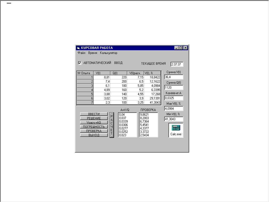 Курсовая работа включает в себя три различных варианта ввода данных значений: автоматический (наиболее простой) и два ручных: открытие файла и самостоятельный ввод каждого отдельного числа (значения). Кроме этого, работа включает в себя универсальный инженерный калькулятор, необходи-мый для каких либо вычислений. Построенные графики зависимостей в про-граммах позволяют выбрать наиболее приемлемый закон, а также сам язык программирования.