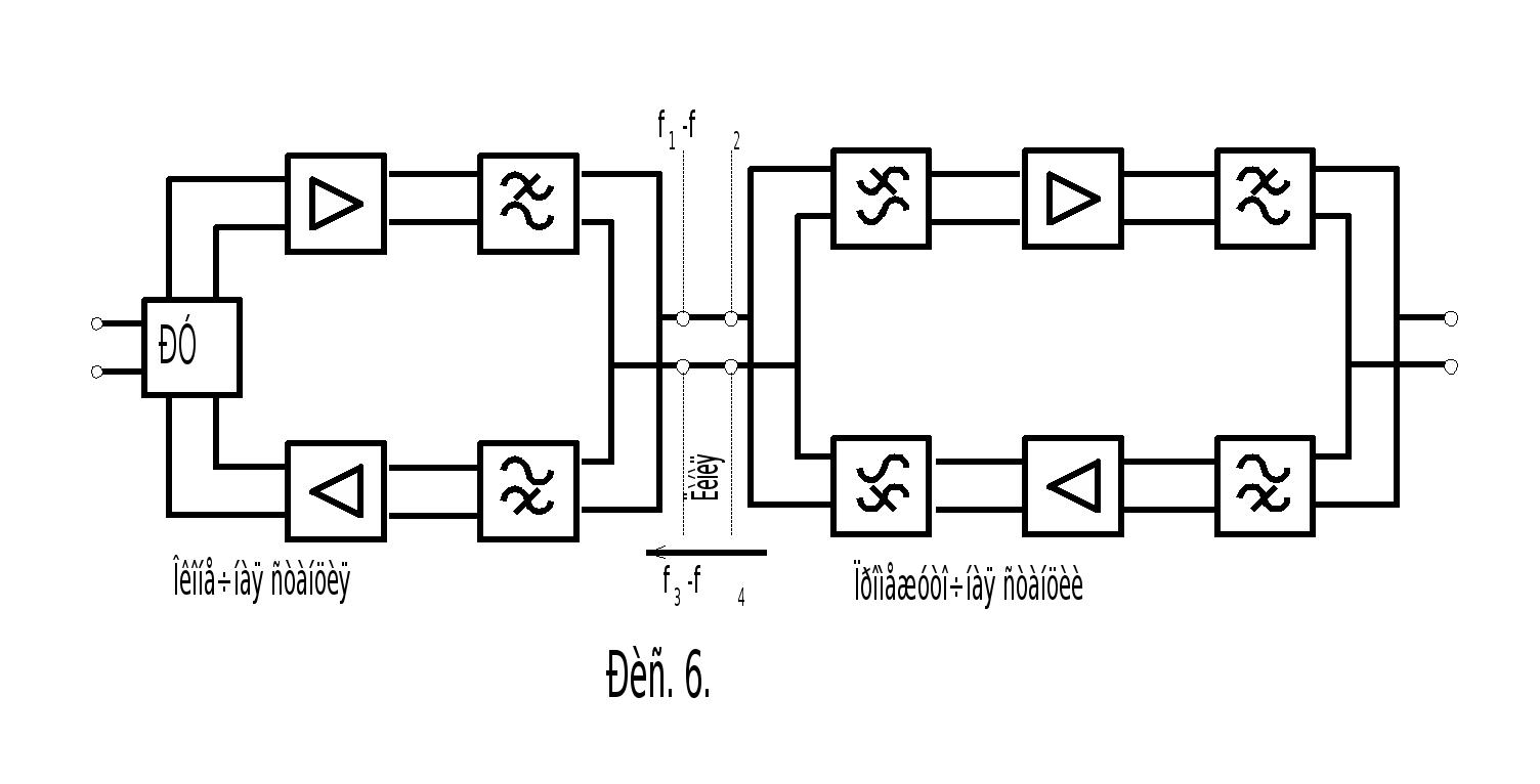 Здесь используется одна двухпроводная цепь, по которой передача сигналов в двух направлениях осуществляется в разных спектрах частот. Направляющие фильтры соответственно низких высоких частот служат для разделения спектров частот двух направлений передачи.