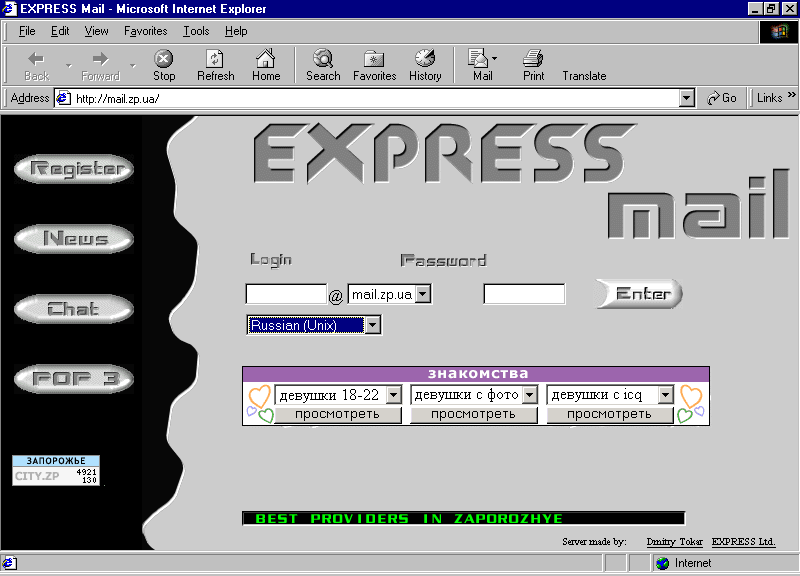 http://mail.zp.ua Для тех, кто живет в Украине. Сервер расположен в Запорожье. Стабильно работает вот уже полгода!!! Вы получаете E-Mail адрес <ваш адрес@mail.zp.ua> Размер получаемого почтового ящика 5Mb. Доступ по протоколу POP3 и через браузер.
