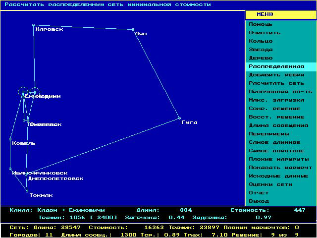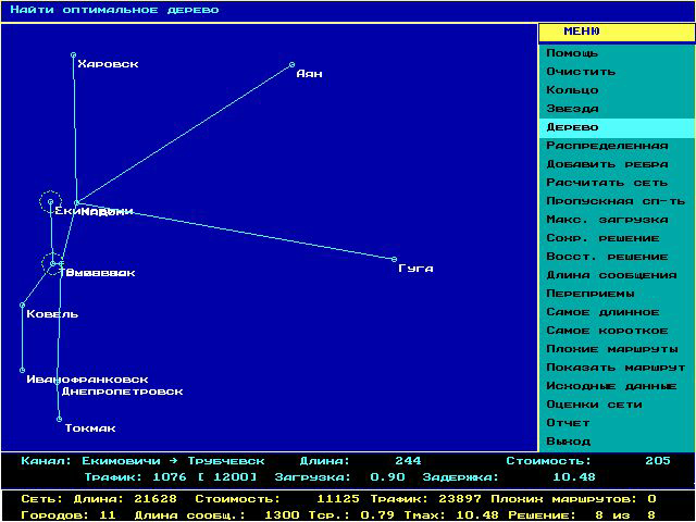Для синтеза оптимальной древовидной сети используется алгоритм Прима, который порождает минимальное связанное дерево. Рассматривается определенное множество городов, которые необходимо объединить. Рис. 8.
