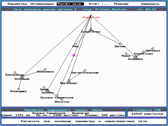 В данной курсовой работе согласно техническому заданию была спроектирована распределенная информационно-вычислительная сеть. Для этих целей использовался программно-инструментальный комплекс NET-PRO. Перед проектированием сначала был произведен топологический синтез, а именно, было определенно количество узлов сети и способы их связи между собой и источниками информации, а так же параметры и места размещения каналов связи, концентраторов и т.п.